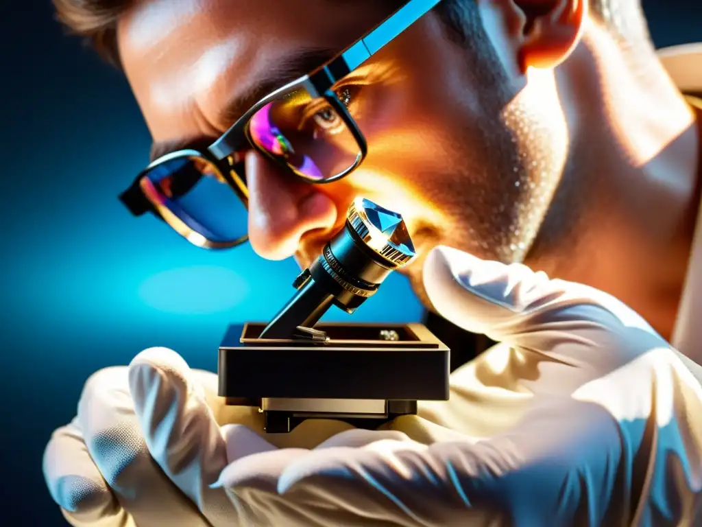 Un gemólogo examina detalladamente un diamante bajo luz intensa, resaltando sus facetas brillantes